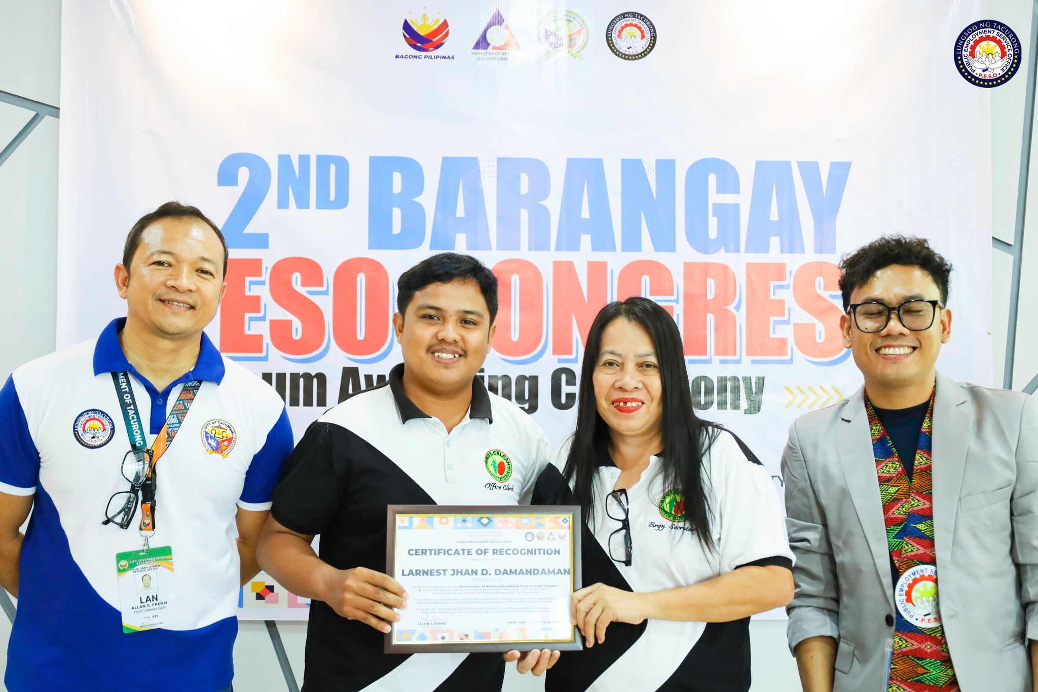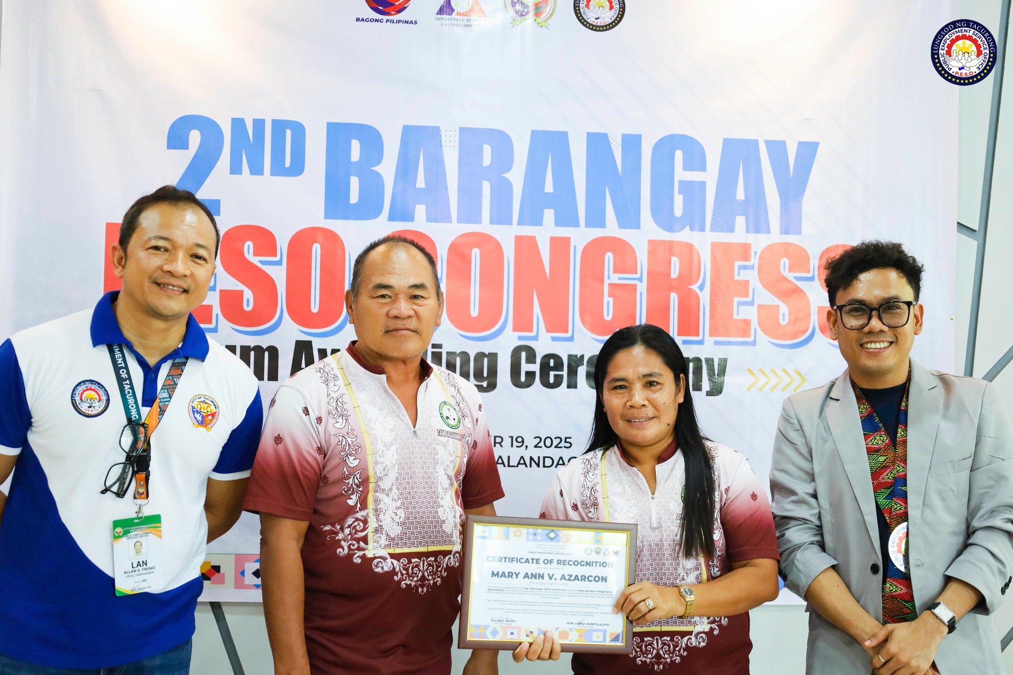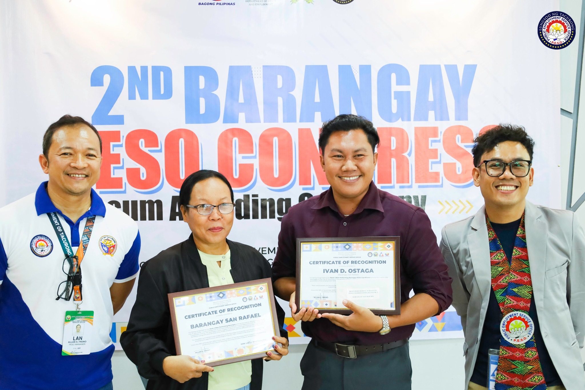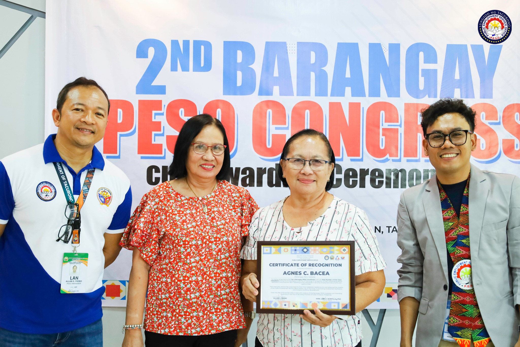 Leading this yearโs recognitions, Ms. Mary Ann V. Azarcon of Barangay Virginia Griรฑo once again emerged as Rank 1 Best-Performing Barangay PESO Coordinator, retaining the same title she earned during last yearโs Barangay PESO Congress. She was followed by Mr. Ivan C. Ostaga of Barangay San Rafael (Rank 2), Mr. Aeron C. Tictic of Barangay Buenaflor (Rank 3), Ms. Ellyn C. Casipe of Barangay Baras (Rank 4), and Mr. Henry P. Bartal of Barangay Upper Katungal (Rank 5).