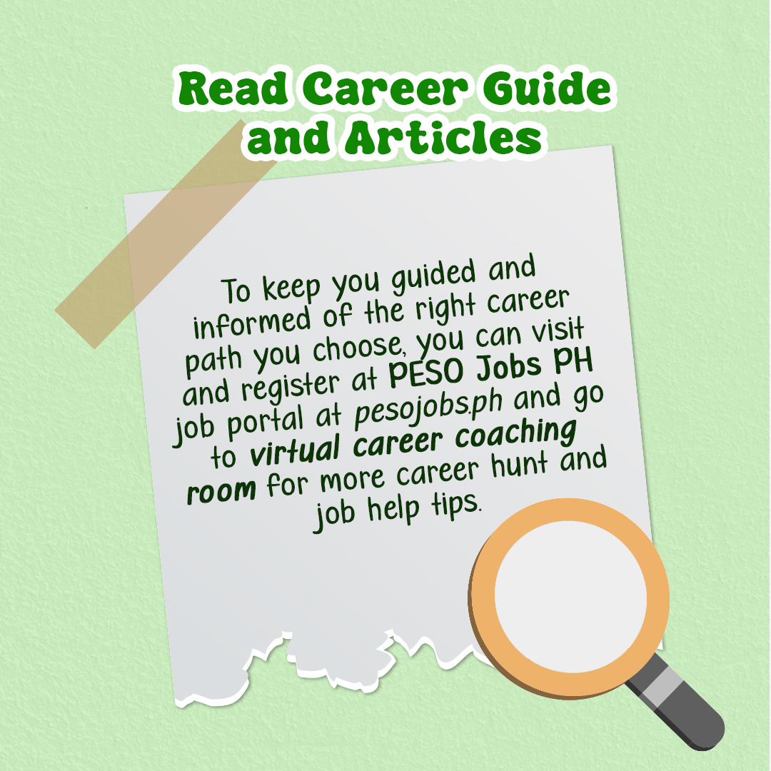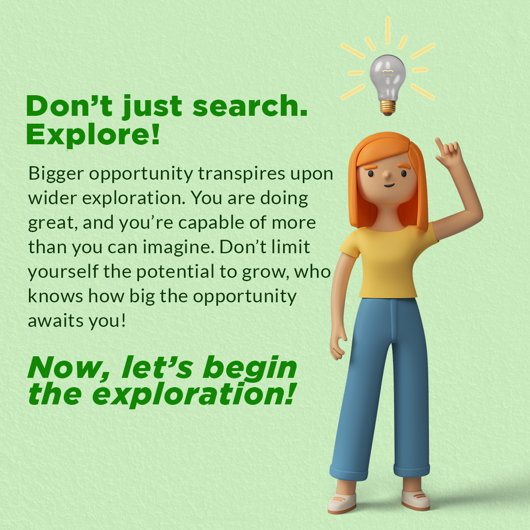 π˜Ώπ™€π™£β€™π™© π™Ÿπ™ͺ𝙨𝙩 π™¨π™šπ™–π™§π™˜π™. 𝙀𝙭π™₯π™‘π™€π™§π™š! Bigger opportunity transpires upon wider exploration. You are doing great, and you’re capable of more than you can imagine. Don’t limit yourself, who knows what big opportunity awaits! Check out the fourth episode of PESO’s Career Hunt Series on Explore Career Options! Let’s begin the exploration!Β